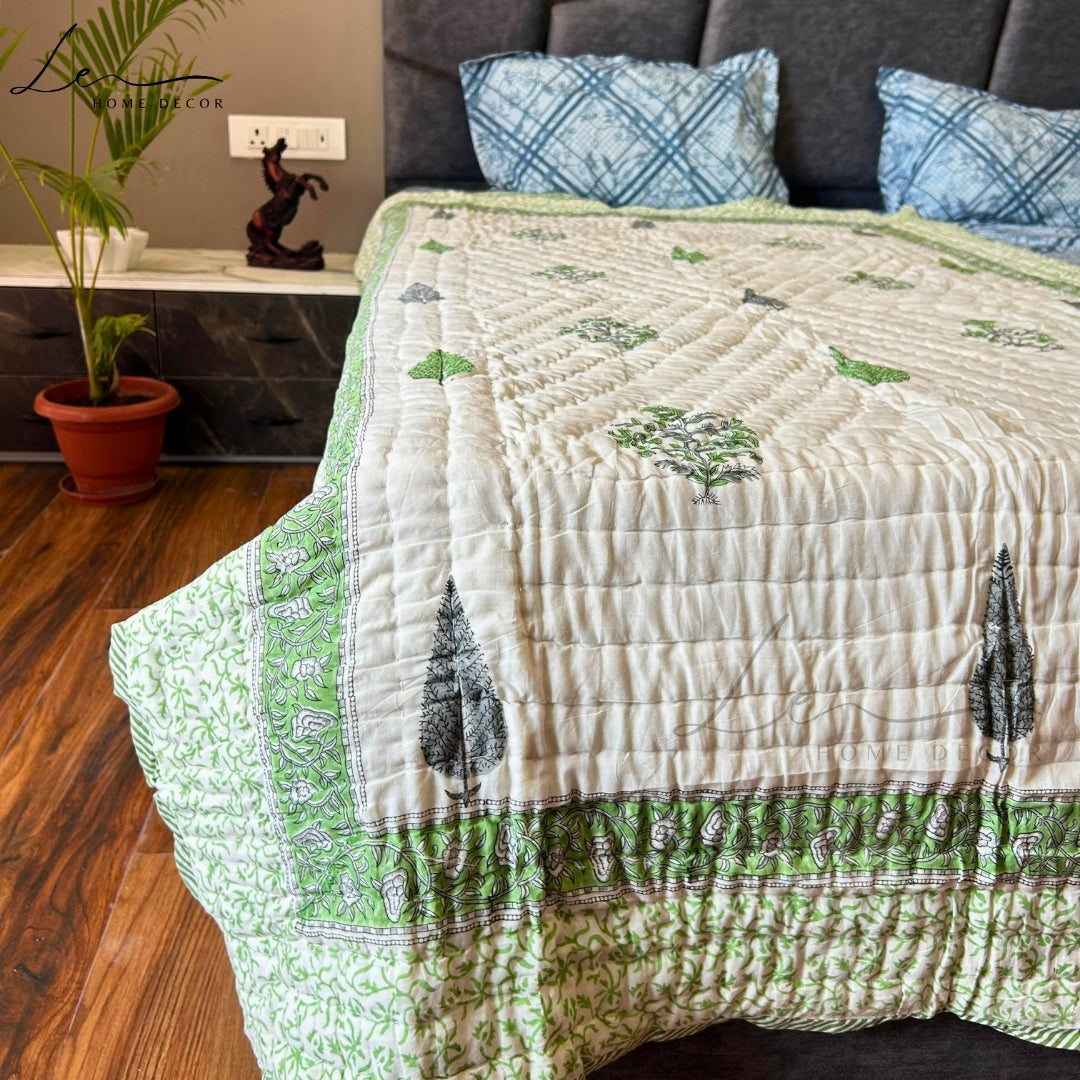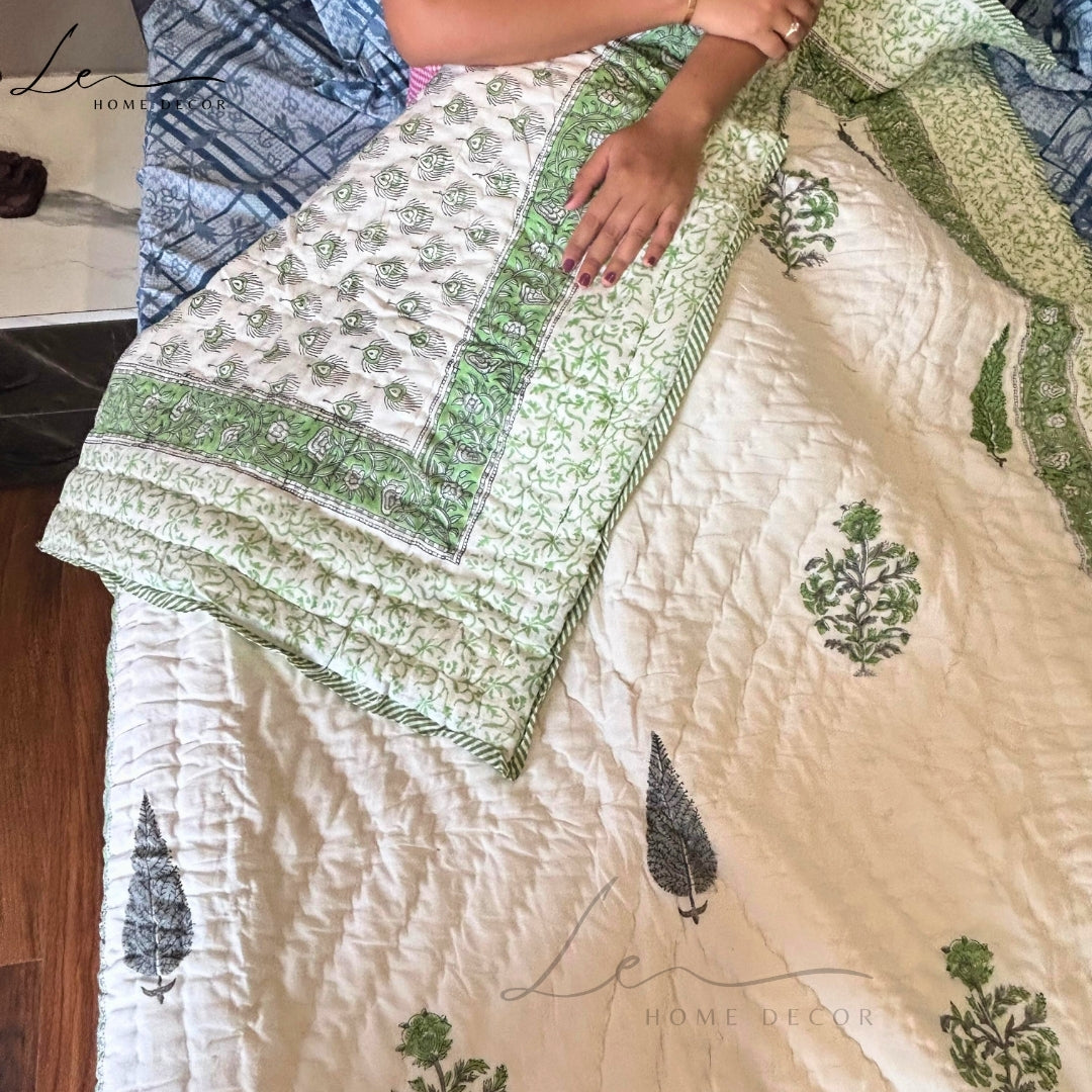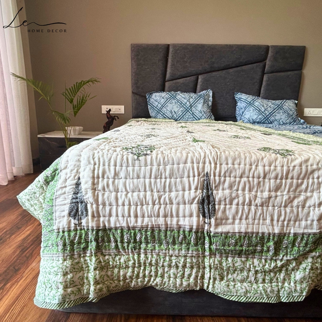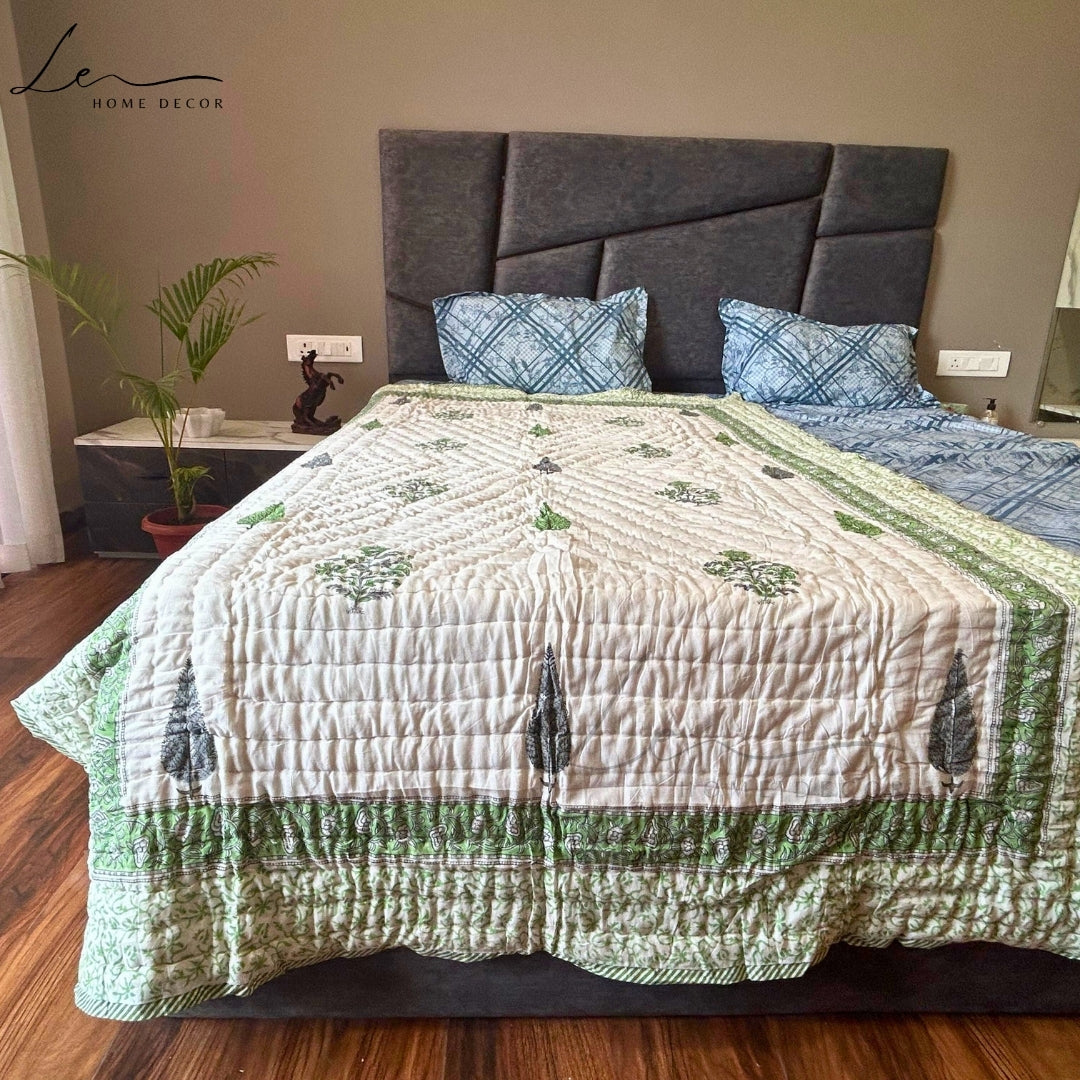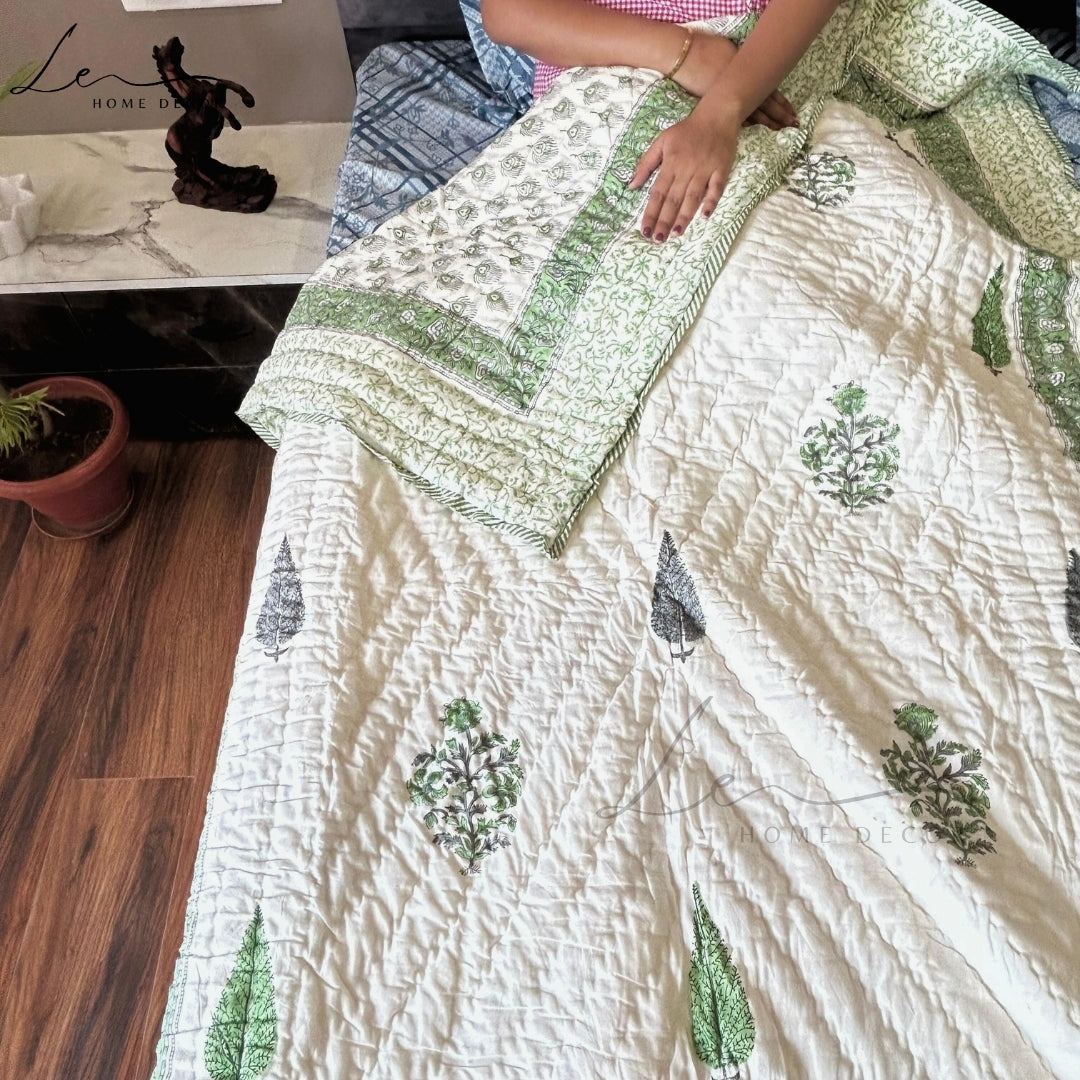 Hand Block Printed Organic Cotton Quilted Blanket - Forest Green