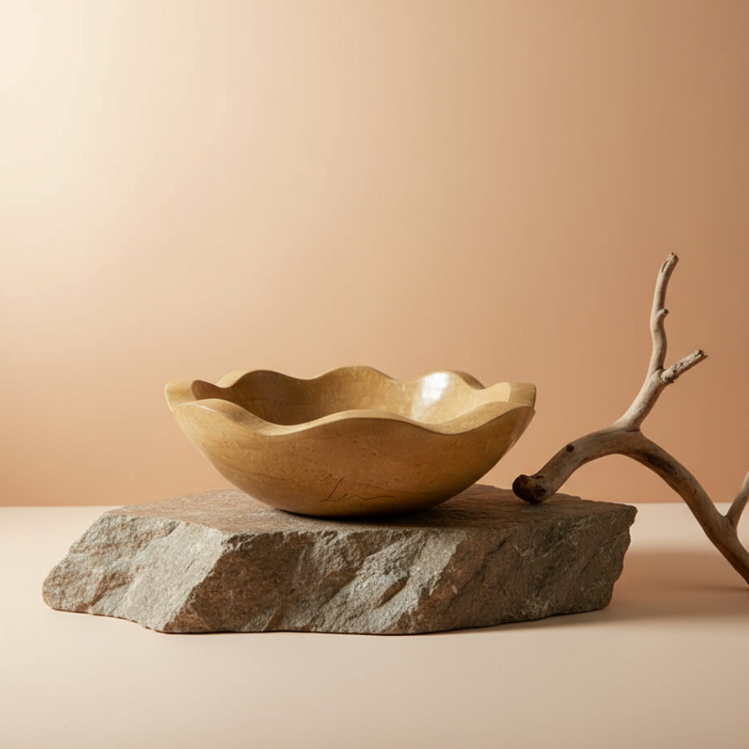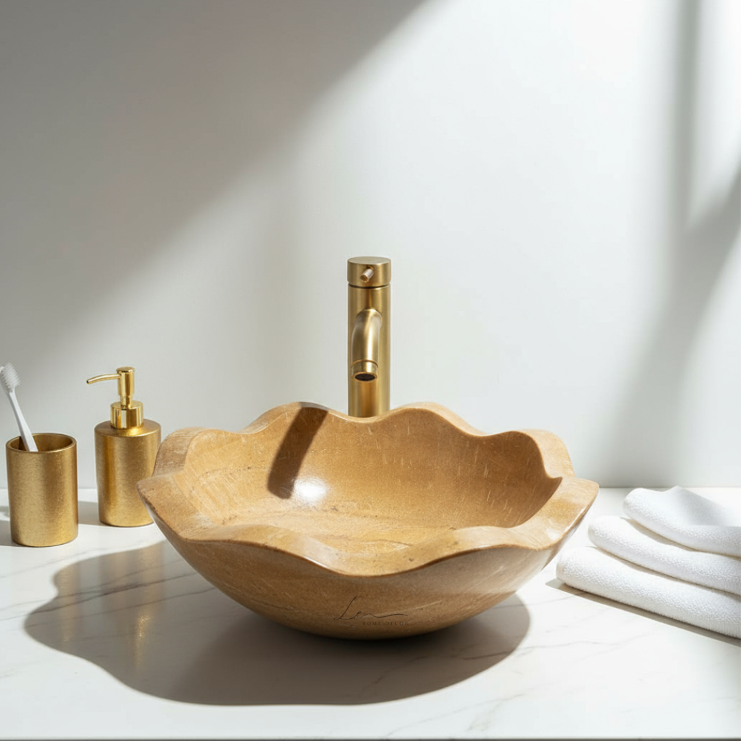 This unique and mesmerizing fluted wash basin is crafted from one single block of natural Jaisalmer brown stone and is handcrafted in a fluted, wavy shape, which will become the focal point of attention in your bathroom. This natural stone sink is available in different sizes to meet every space's needs.