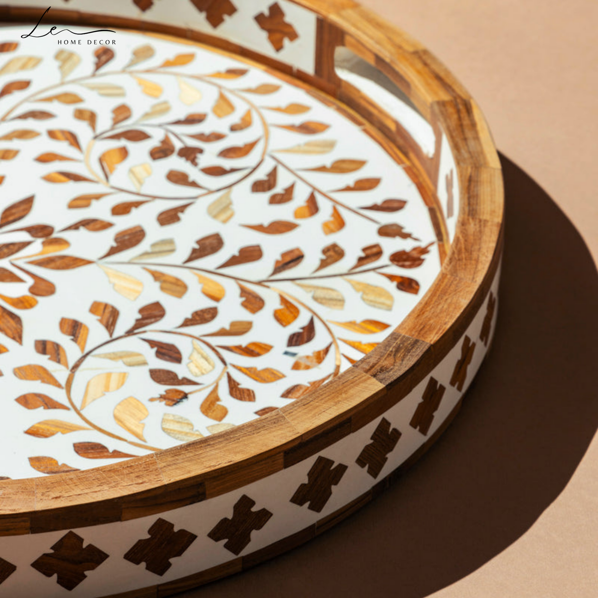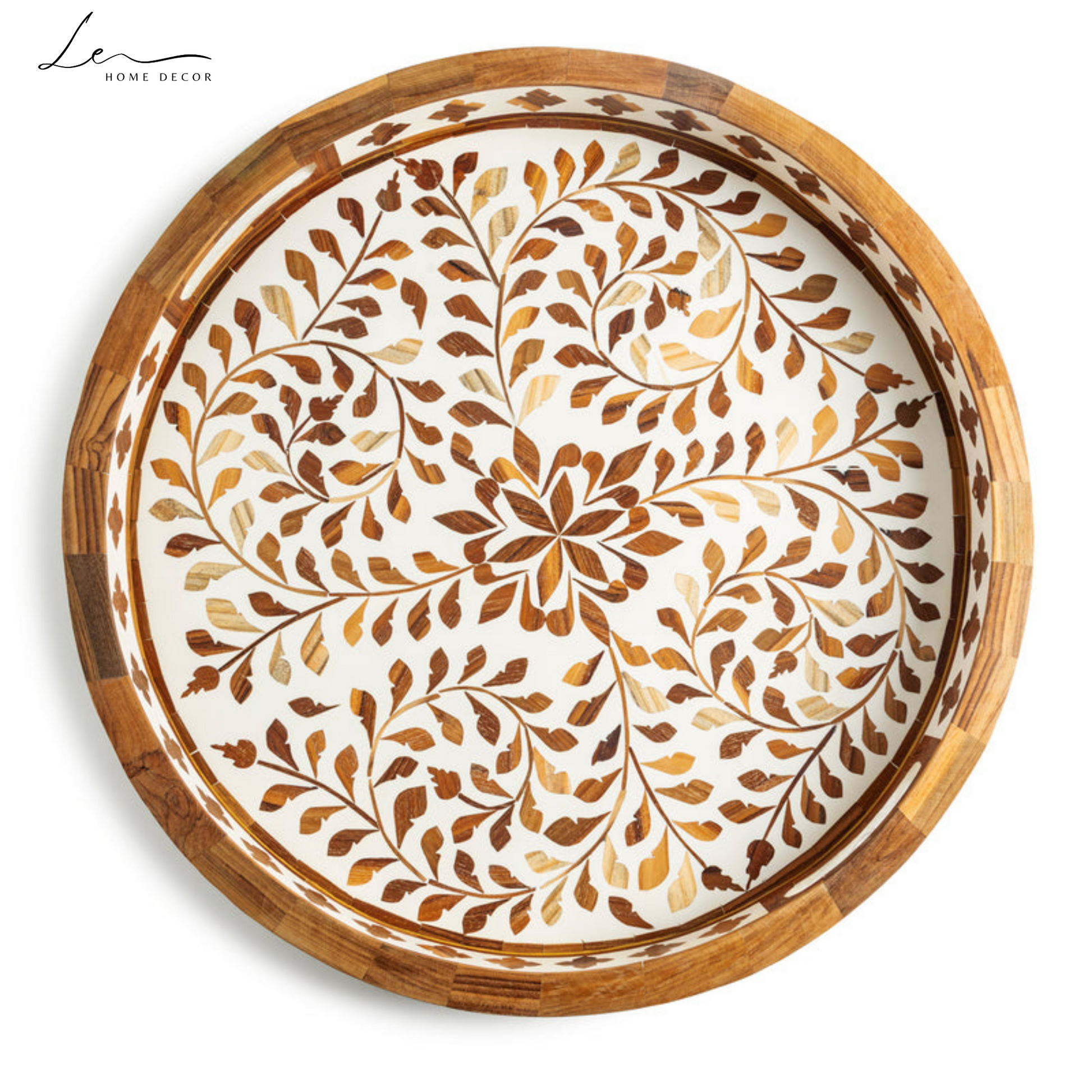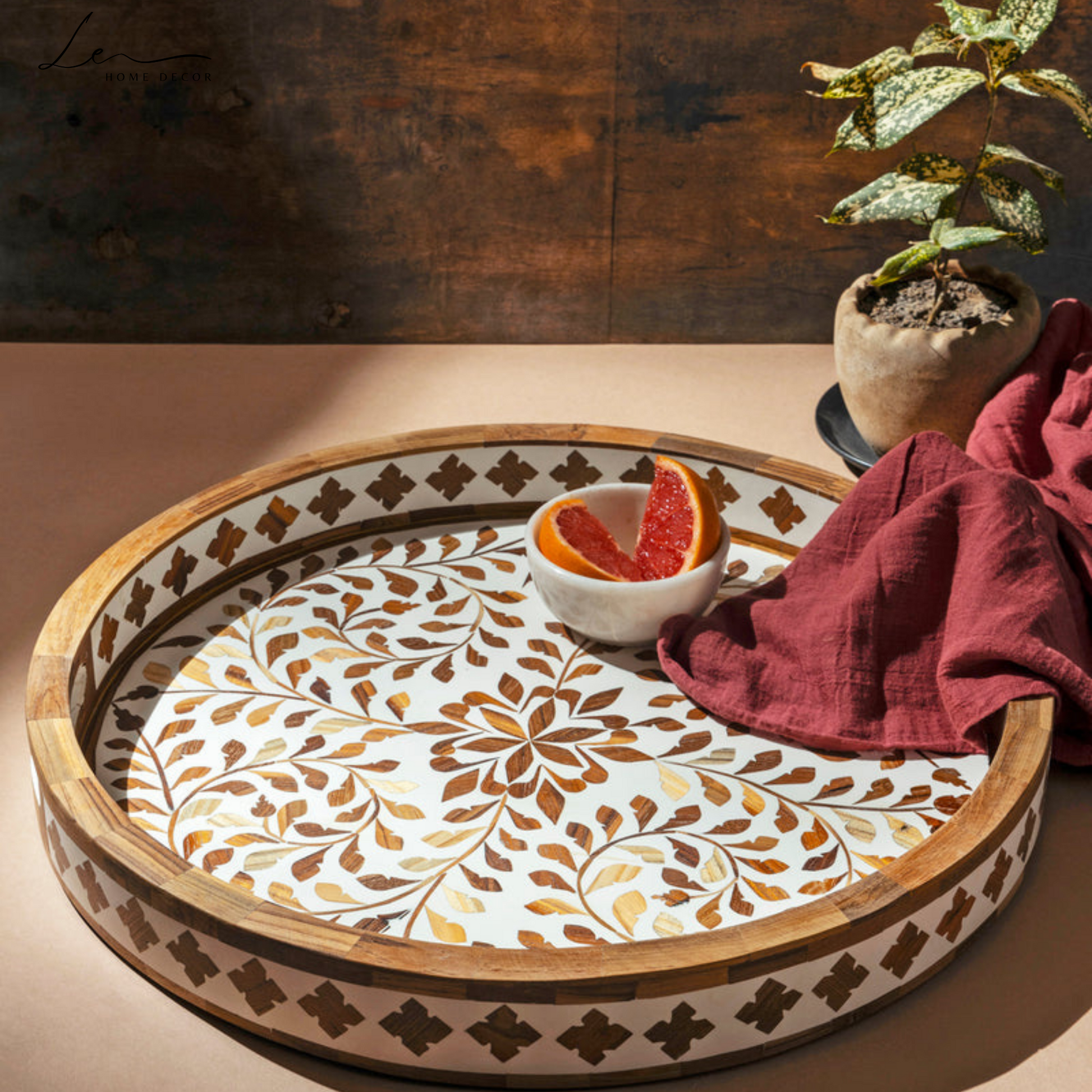This decorative tray features an intricate floral design. Handcrafted by skilled artisans from Rajasthan, India. The exquisitely designed yet simple round tray is the ideal centerpiece for any space. It can be used as a serving tray as well.