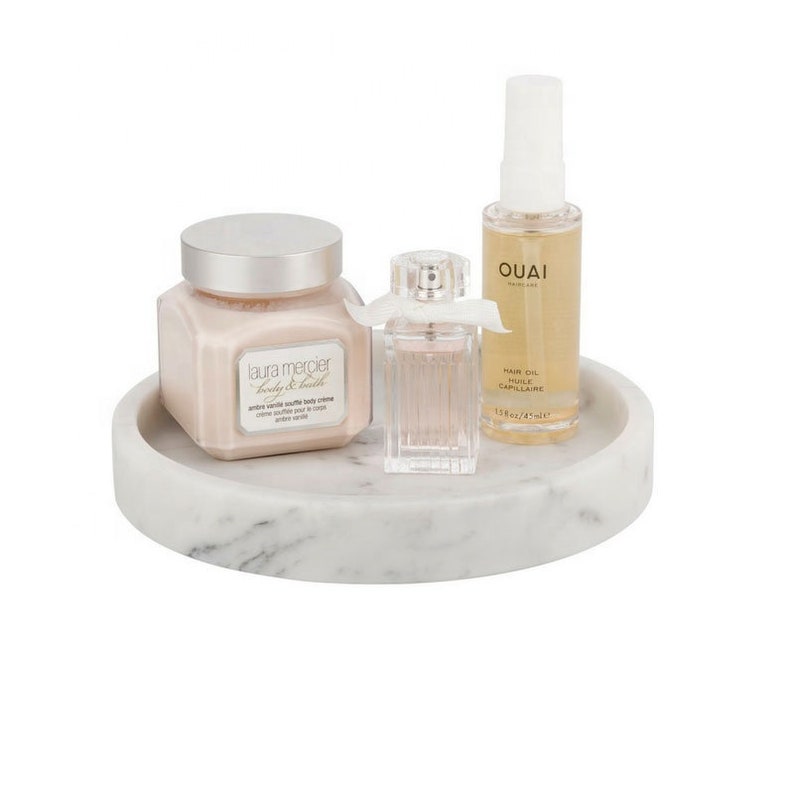 The classic round trays handcrafted from natural Indian white marble are suitable to store almost anything such as jewelry, bathroom toiletries, and perfumes, or can also be used as a serving platter.